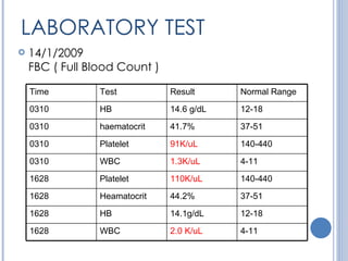 Platelet agen pembekuan darah Hematocrit kepekatan darah White blood cells sel darah putih Typically org yg ada denggi akan rendah bacaan platelet dan white blood cell dan hematocrit akan tinggi. Result darah siap dalam masa 5. A drop in the platelets count below 150000 or a platelets count below the 25th percentile for pregnant patients ie.